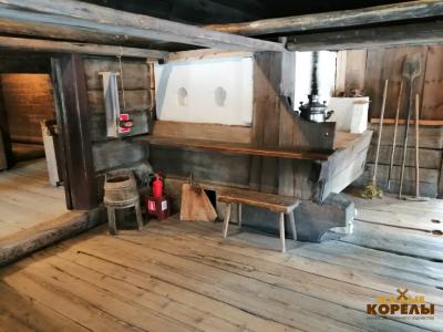 Такой тип топки был распространен также и в северных уездах Архангельской губернии – Мезенском и Лешуконском. Здесь, в отличие от каргопольских домов, отапливалась и горенка, которая зачастую устраивалась на повети дома. Делалось это в связи с тем, что дом могли начинать строить с хозяйственного двора для защиты домашнего скота от морозов. В таком случае семья проживала в поветной горнице, пока строилась изба.