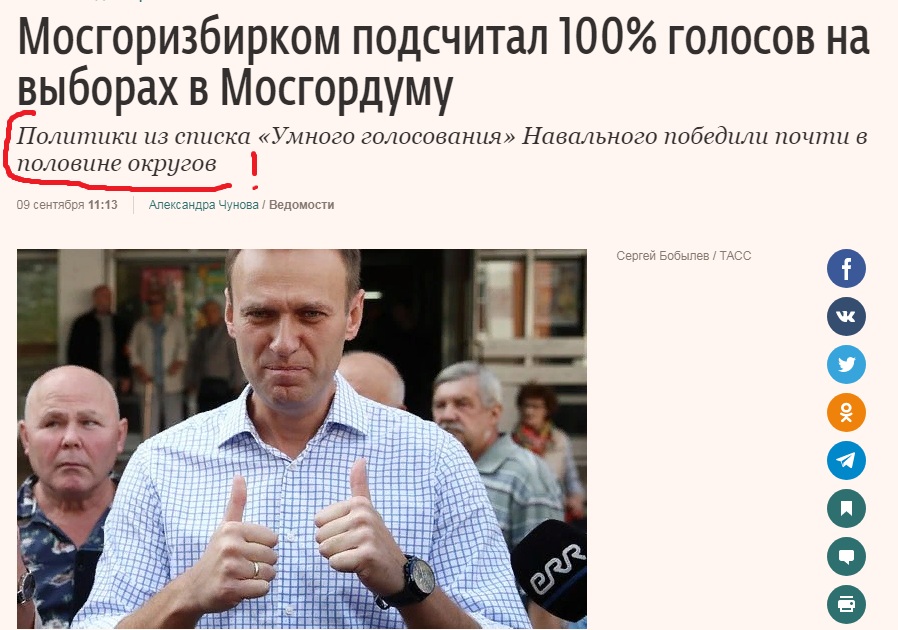 И на следующий день после выборов  крупные СМИ выходят с заголовками типа приведенного мною заголовка "Ведомостей".     Мол,  кандидаты "Умного голосвания"  Навального получили 20 мест из 45 в Мосгордуме.