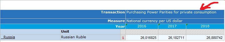Ну а теперь моё любимое- конкретика со ссылками на источники. Ну или, так сказать, контрольный выстрел. Сходим-ка на официальный сайт ОЭСР (он не только ВВП по ППС публикует, но и сами коэффициенты ППС, причём как по экономике в целом, таки и для её части- потребительского сектора (тех самых стрижек, маникюров и прочей еды). Сначала смотрим ППС для ВВП в целом. То есть сколько рублей за доллар надо бы давать если сравнивать уровень цен по экономике в целом: