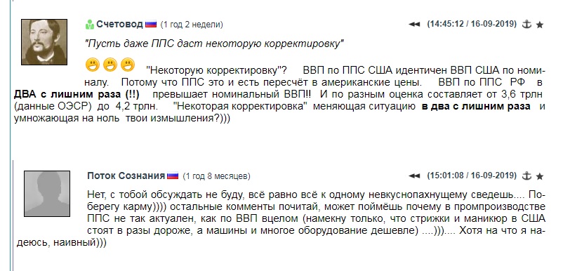 Отдельно для НЕпотребительского сектора ППС не приведён. Да этого особо и не требуется. Потому что я надеюсь, что аудитория АШ состоит, в основном, из людей которые не прогуливали уроки математики в средней школе. Если у вас, грубо говоря, по экономике в целом соотношение цен что-то около 2,5 (биржевой курс 64 руб за доллар делим на курс ППС 25,6 руб за доллар), а по потребительскому сектору 2,4 (64/26,9), то утверждать что в оставшейся, НЕпотребительской части соотношение гораздо меньше, (а Поток Сознания договорился до того, что в США вообще дешевле) - несусветная дичь. Более того- как мы видим в потребсекторе соотношение цен даже поменьше чем в среднем по экономике, а значит (математика) в НЕпотребительском секторе оно будет даже повыше среднего! То есть с Потоком Сознания несёт просто треш, искажающий ситуацию В РАЗЫ!