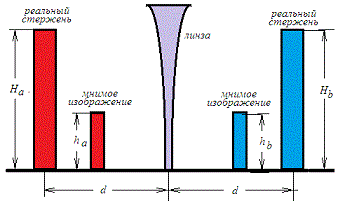 Первый наблюдатель рассматривает конструкцию справа, второй наблюдатель рассматривает конструкцию слева. Правый наблюдатель видит перед собой синий стержень Hbи сквозь линзу он видит красный стержень hа. Правому наблюдателю кажется, что синий стержень длиннее красного Hb > ha . Левый наблюдатель утверждает обратное. Он считает красный стержень длиннее синего стержня, Ha > hb. Какой из стержней длиннее на самом деле?