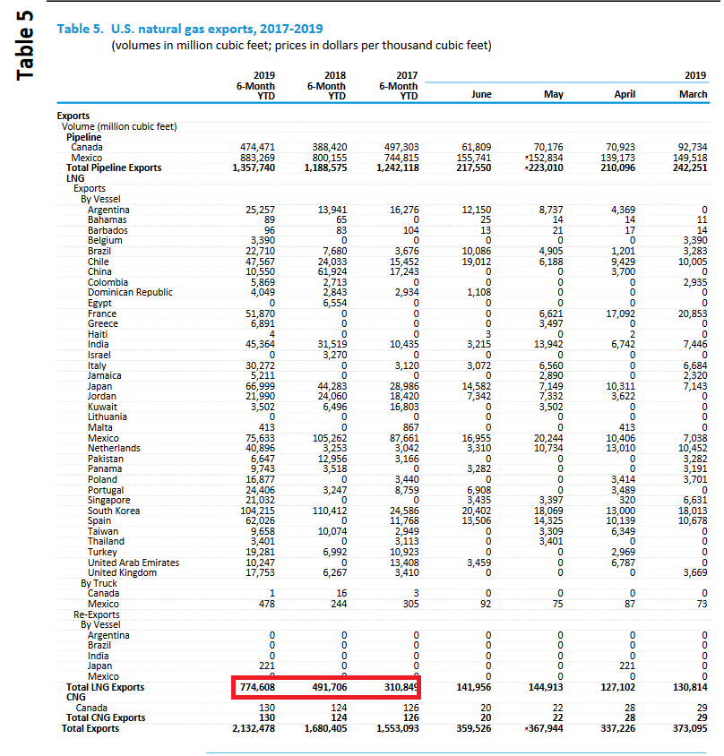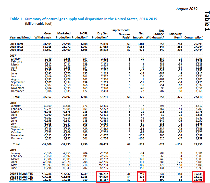 Ниже добыча, потребление и чистый импорт (отрицательный) в млрд куб футов за 6 мес 2019-го. Видно потребление полгода к полгоду выросло меньше чем добыча (выделено красным).