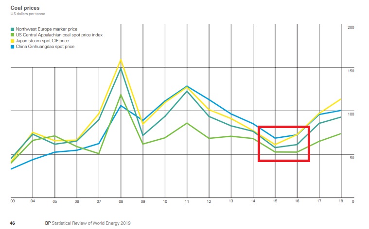 На самом деле, в 2015-2016 годах цены на уголь сильно просели, из-за мантр про экологию и все такое. И вот на низких ценах Китай сократил свое производство а больше закупал за границей. Чтоб не тратить собственные ресурсы. Напомню, что запасов у Китая и так не сильно многою