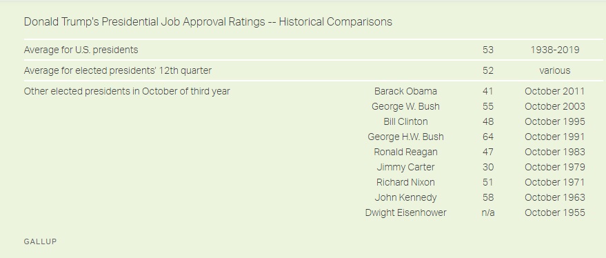 Крупнейшая социологическая контора США (и не только) Gallup публикует свежие результаты соцопроса по одобрению деятельности президента США. Что любопытно, методологически опрос сопоставим с опросом по России, результаты которого, так же за октябрь 2019, мы рассматривали на днях https://aftershock.news/?q=node/803103.