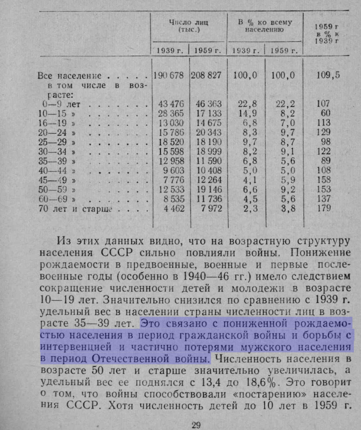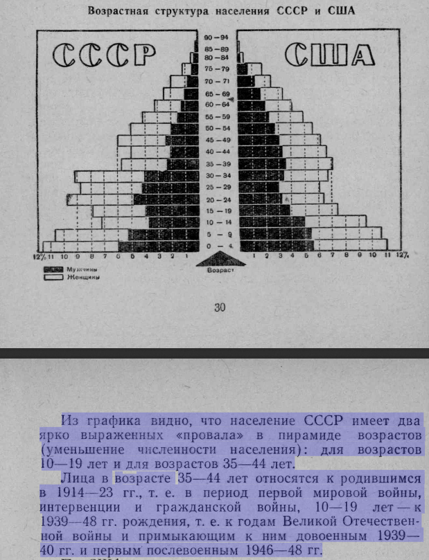 Как видно из картинки, имеется провал среди сорокалетних в 1959-м году. Это результат 1-ой мировой и Гражданской войн. Такой же сильный провал в группе 15-тилетних. Это результат первого провала и наложившейся Великой Отечественной войны. И официальная статистика того времени это подтверждала. Ниже данные из статистики СССР