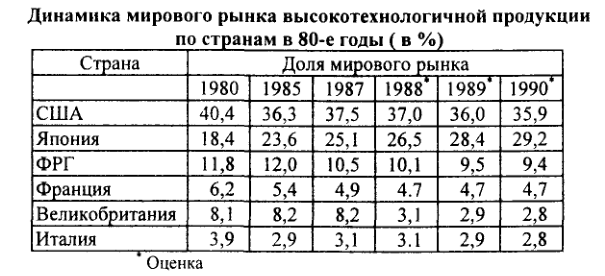 Еще один параметр с более четкой материальной сущностью приведен в следующей таблице, это - доля мирового рынка высокотехнологичной продукции, приходящаяся на ту или иную страну, ее изменение за 80-е годы.