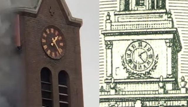 Время, застывшее на них соответствует времени на часах башни, изображённой на 100-долларовой банкноте...