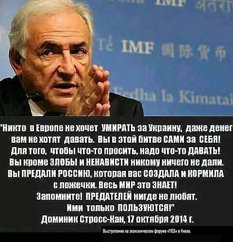 Украина, 12 сентября 2014, 14:23 — REGNUM «Никто в Европе не хочет умирать за Украину, даже денег вам не хотят давать. Вы в этой битве сами за себя» — об этом во время выступления на конференции YES-2014 в Киеве сегодня, 12 сентября, заявил экс-глава МВФ и нынешний директор компании Leyne Strauss-Kahn & Partners Доминик Стросс-Кан, сообщает корреспондент ИА REGNUM.