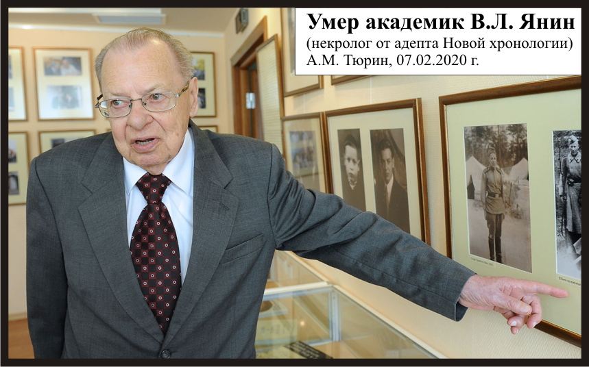 Заслуги В.Л. Янина в области изучения материального наследия России большие. Он ввел в научный оборот огромное число артефактов, часть из которых раскопал сам. Выполнил (вместе с другими археологами) и их интерпретацию. По ее результатам создан виртуальный феномен (модель, реконструкция) «Археология Древней Руси». На примере Новгородской археологии авторы Новой хронологии А.Т. Фоменко и Г.В. Носовский показали наличие в нем хронологического сдвига примерно на 400-500 лет. Специально отмечу, что это ни в коей мере не умаляет заслуги В.Л. Янина в части «ввел в научный оборот».