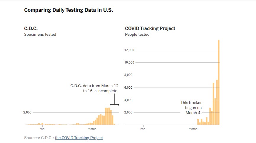 Работа интернет-сообщества, названная COVID Tracking Project, пытается дать более полную картину тестирования в Соединенных Штатах. Согласно данным трекера, который собирает информацию непосредственно из департаментов здравоохранения штата, местных новостных сообщений и пресс-конференций в прямом эфире, по крайней мере 41 000 человек прошли тестирование в Соединенных Штатах, что намного выше, чем официальное число C.D.C ( центр контроля заболеваний США)