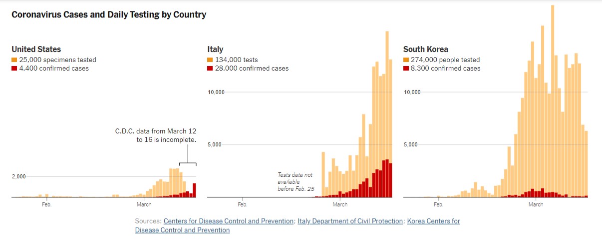 Вначале было очень медленное реагирование на проблему. Данные тестирования на коронавирус были труднодоступными в Соединенных Штатах. Исходя из официальных правительственных источников, вот как сравниваются усилия по тестированию в Соединенных Штатах с усилиями в Италии и Южной Корее: