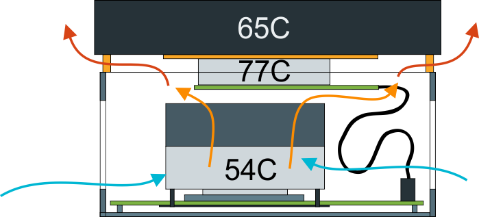 К тому же, вентилятор был перевёрнут вверх ногами, чтобы он не вдувал горячий воздух в плату, а отводил его наверх. Схема вентиляции получилась такая.