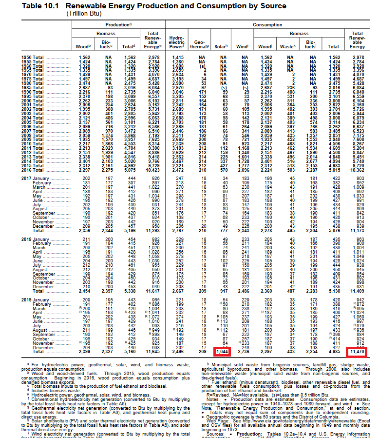 Заметим, что с 2005 года производство первичной энергии, связанное с добычей ископаемого топлива выросло с 55 квадриллионов (1015) BTU до 81. Или на 26 квадр и в 1,47 раза. За счет возобновляемых источников – с 6,221 квадр до 11,645. Относительный рост в 1,87 раза (это больше, чем для ископаемого топлива за счет низкой базы). Абсолютный на 5,424 квадр, что почти в 5 раз хуже по сравнению с ископаемым топливом. А за 2019 год рост первичной энергии за счет ископаемого топлива составил порядка 5,3 квадр BTU (с 75,667 до 81,006), в то время как за счет зеленки роста практически не произошло (изменение с 11,617 квадр до 11,645).