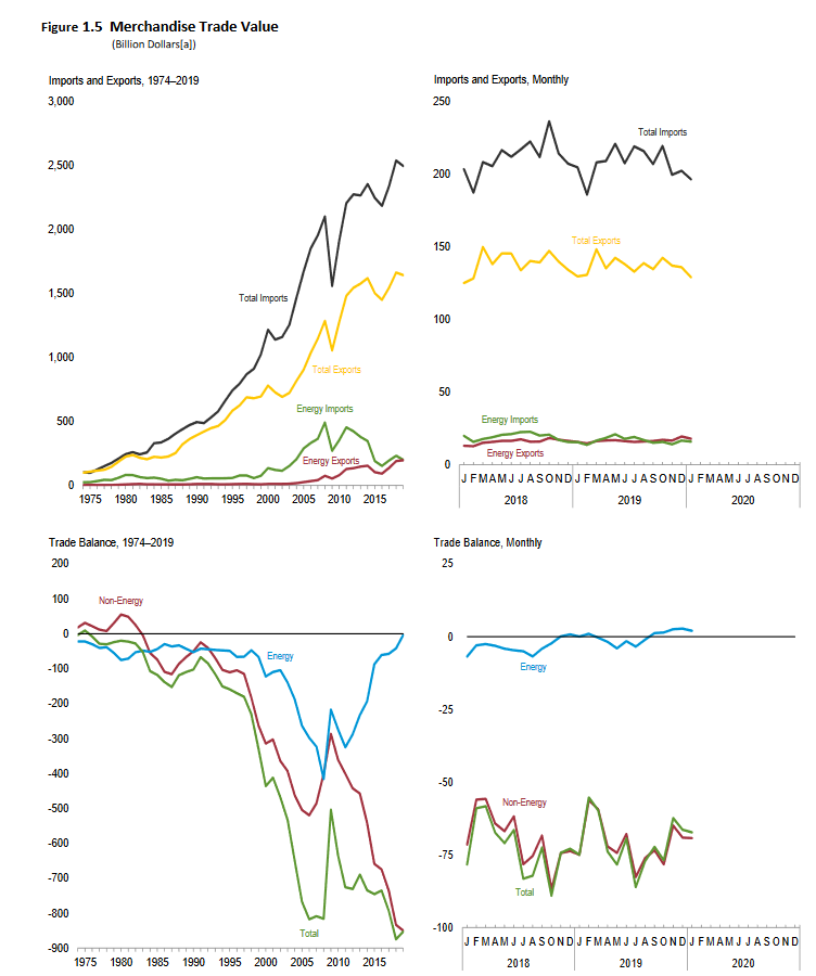 Из таблицы видно, что по итогам 2019 года чистый импорт энергоресурсов составил $3,104 млрд (на полшишечки не вошел в положительную область), уменьшившись за два года на $54,2 млрд. А по сравнению с 2008-м годом (худшим по торговому балансу) уменьшился более, чем в 100 раз. Однако это никак не отразилось на общем торговом балансе. Так за 2 года общий торговый баланс ухудшился на $59,395 млрд. Конечно, без "сланцевой революции" он был бы еще хуже.