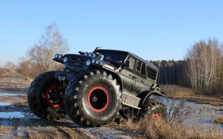 Высота колеса — 1700 мм. Шины стоят на 26-дюймовых дисках с приспособлением beadlock, т.н. «бэдлоки», не допускают разбортирования колеса при движении, когда вездеходной шине приходится изрядно деформироваться, работая даже на давлении в 0,3 атмосферы. Конечно, такие колеса потребовали вмешательства в ходовую часть. Родные мосты были заменены на мосты от грузовика ГАЗ-66, оттуда же перекочевала и централизованная подкачка шин. Подвеска в значительной степени изменилась и была усилена, теперь она пружинная спереди и сзади.