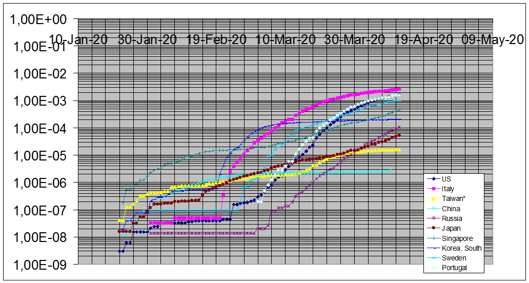 Развитие эпидемии во всех странах происходит по похожему сценарию, отличаясь сроком начала и скоростью роста. Также, здесь видно, что по числу заболевших на душу населения все представленные страны уже давно и надёжно обогнали Китай, как и признанные «лидеры» Италия и США, так и теряющиеся в хвостах списков Тайвань и Сингапур, и, увы, Россия. При этом скорость распространения эпидемии в европейских странах многократно превышает скорость распространения в странах юго-восточной Азии, как тех, которые принято относить к «авторитарным», так и тех, кого именуют «демократическими». Видно, что Россия по скорости роста, занимает промежуточное положение между Азией и Европой, как и положено Азиопе, впрочем, всё же более тяготея к Европе (что и не удивительно, поскольку основные заболевшие пока сконцентрированы в Москве и Петербурге, находящиеся, всё же, в Европейской части России…)