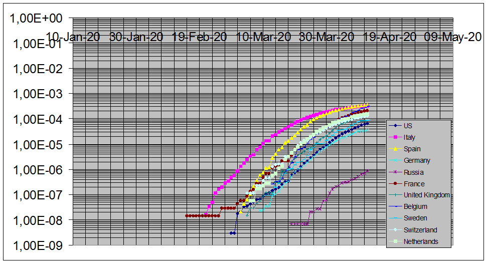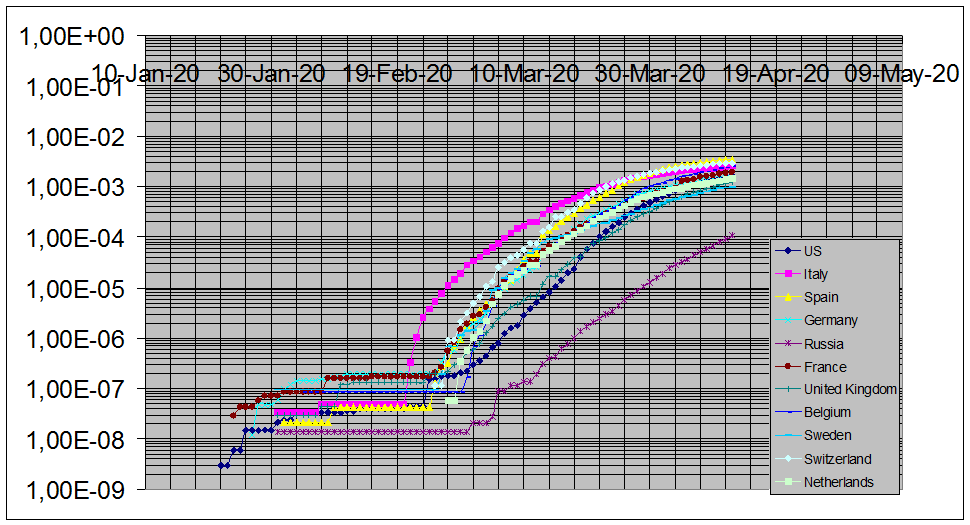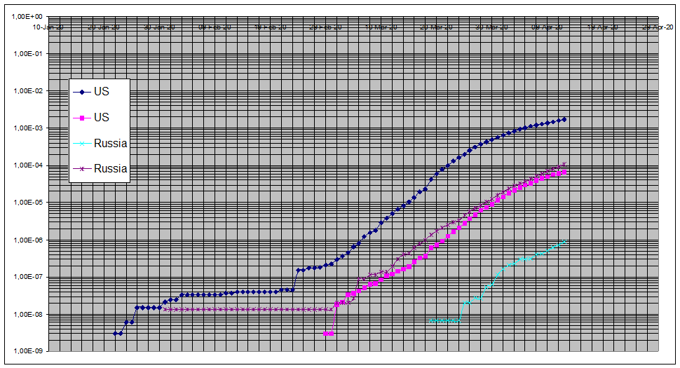 На графике представлены нормированные кривые числа смертей для «большой» Европы, США и России. Видно, что в пределах Европы и США значения количества смертей на душу населения отличаются практически на порядок, минимальны для Германии (и Австрии) и максимальны для Италии-Испании-Бельгии. Последняя, согласно тренду, рискует оказаться лидером. Также очень печальны перспективы Британии. Отставание России из этих графиков можно оценить в 16-20 дней. Общий наклон графика для России (смертность), несколько ниже средне-европейских.
