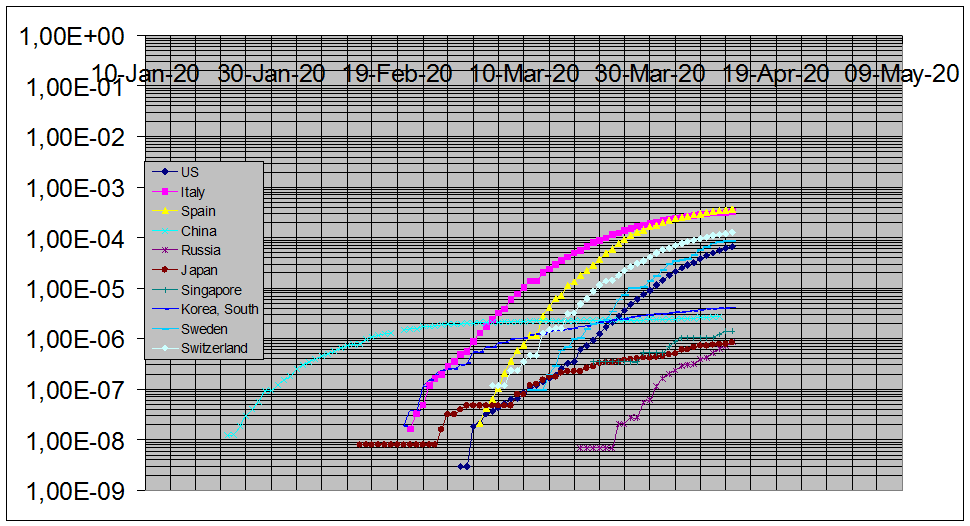 К сожалению, традиционное представление данных в виде таблицы текущих значений малоинформативно, и не позволяет корректно сравнивать между собой ситуацию в разных странах. Для приведения данных к единому масштабу, в первую очередь необходимо перейти от абсолютных значений числа заболеваний или смертей, в той или иной стране, к величинам их значений на душу населения, т.е. отнормировать все величины на значение численности населения страны. Данные по численности населения стран взяты из Википедии. Поскольку динамика развития эпидемии описывается экспоненциальными функциями, для одновременного представления на графике разных этапов эпидемии нормированные графики представлены в логарифмическом масштабе. При этом экспоненциальному росту соответствует линейный график, а отклонение кривой от экспоненты, практически не различимое глазом при традиционном представлении, при представлении данных в логарифмическом масштабе, становится легко наблюдаемым в виде отклонения графика от прямой линии.