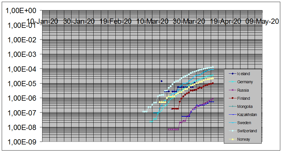 Здесь присутствует вся Скандинавия и, для комплекта, Исландия, неожиданно оказавшаяся лидером по степени зараженния. Обращает внимание, что эпидемия во всей Скандинавии началась практически одновременно и формы кривых у них странным образом похожи, выход на гладкую кривую случается только в интервале 10-4 - 10-5. Есть подозрение, что начальный участок кривых это начало и темпы тестирования, а не реальная эпидемия. То же можно сказать и про Италию. А вот Казахстан и Монголия лежат совсем в Российском тренде, правда, стремятся перейти в стабильную фазу на совсем низких цифрах, как и положено азиатам.