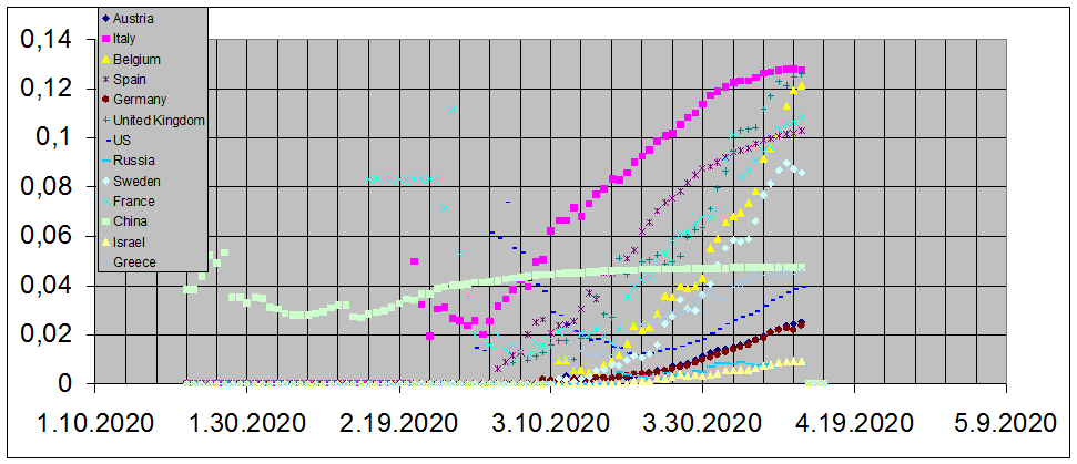 На этом графике в линейном масштабе представлен результат от деления числа умерших на число заболевших, для разных стран. Пока эпидемия растёт и число вновь заболевших сильно превышает численность зараженных ранее больных уже подошедших к терминальной стадии, эта величина занижает реальную смертность, но, по мере развития эпидемии, она постепенно выходит на насыщение и начинает показывать реальную смертность. Самое интересное, неоднозначное и непонятное, большой разброс этой величины для разных стран. Было бы резонно ожидать близких цифр для разных стран, или цифр скорректированных качеством здравоохранения в стране. На практике это не так. Смертность в Швейцарии 4,5% , а в Турции 2,1% это при близком числе умерших, в Чили 1 %, а в Польше 3,6% при близком числе заболевших. Лидерами по смертности являются Италия, Бельгия, Британия, все они перешли порог в 12%, Франция и Испания перешагнули 10%, Германия и Австрия немногим превышают 2%. Россия и Израиль не дотягивают до 1% . Недостоверность статистики или тестирования не может объяснить такой сильный разброс. Очевидно, что есть некий вешний фактор, провоцирующий смертность или, наоборот, от неё защищающий. Высокая доля пожилых в Италии не объясняет, почему это не работает в практически такой же Германии. Качество здравоохранения тоже не универсальный аргумент. Заметно, что страны расположенные рядом географически, чаще всего имеют и близкие показатели смертности и похожий ход кривой роста числа заражений. А ещё, эпидемия щадит Африку, во всяком случае, пока. И это тоже факт, не имеющий удовлетворительного объяснения.