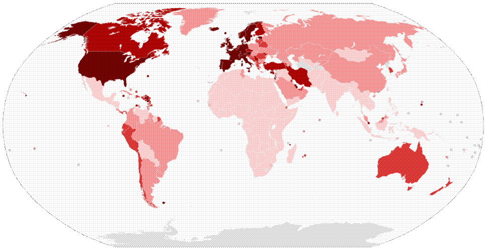 Первое, что бросается в глаза, наибольшее распространение вирус получил среди «благополучных стран». Ну и ещё это страны с хорошим климатом, что, в общем-то, понятно.