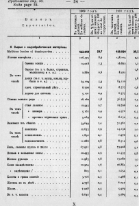В итоге имеем: на долю жизненных припасов, и сырья растительного и животного происхождения приходится - 80%, если исключить чай, сахар, спирт, рыбу и пушнину и "прочие", чистая доля продукции сельскохозяйственного (растительного и животного) происхождения (в т.ч. сырье и полуфабрикаты) составит - 74-75% (из которых продукция растениеводства - 62% и животноводства - 12-13%.