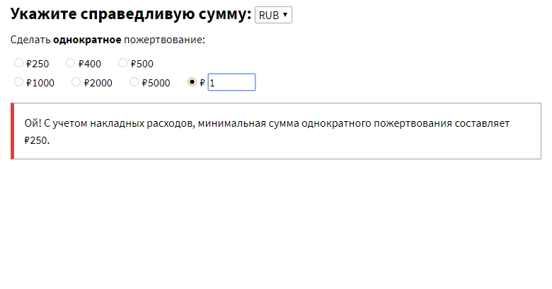 При попытке пожертвовать мало денег-