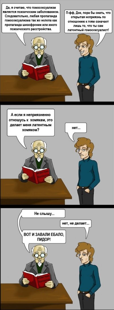 По некоторым исследованиям агрессивная гомофобия следствие латентной гомосексуальности. Просто персонаж с ней борется. Вот и посмотри кто тут набежал в комментарии. Адекватных, действительно здоровых по пальцам одной руки пересчитать.