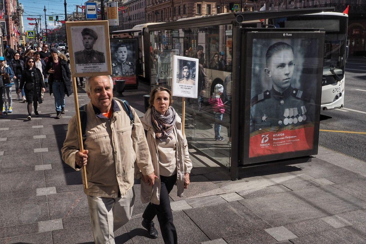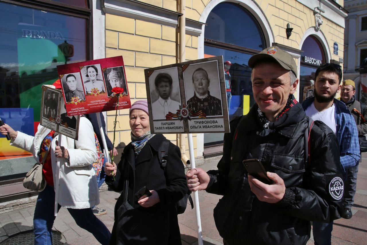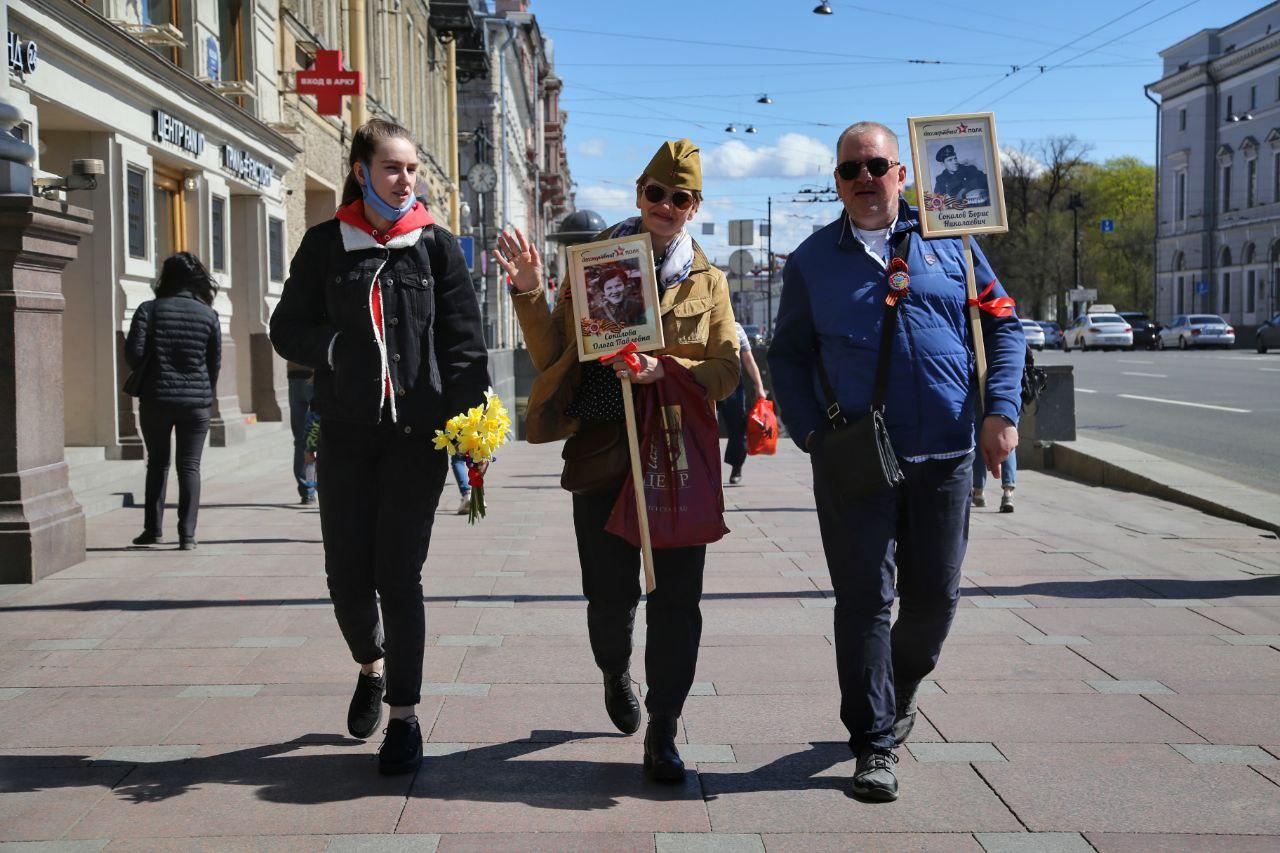 Во второй половине Дня Победы на петербургских улицах заметно больше людей, чем утром. С георгиевской ленточкой на лацкане и портретом деда в руках они прогуливаются по центральному проспекту города. Партизанские отряды «Бессмертного полка» на Невском проспекте заметили фотографы. Не привлекая к себе особого внимания правоохранительных органов, разрозненными и малочисленными группами они передвигаются по Петербургу с портретами фронтовиков. Фотографии своих ветеранов горожане показывают и из окон автомобилей. Тесных рядов петербуржцев не замечено, напротив, практически все соблюдают дистанцию.