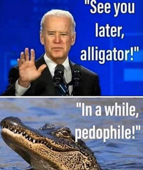 На первой картинке изображен сам Байден, который говорит "до скорой встречи, крокодил" ("see you later, alligator"), а внизу фото крокодила, который отвечает политику "скоро, педофил" ("in a while, pedophile").
