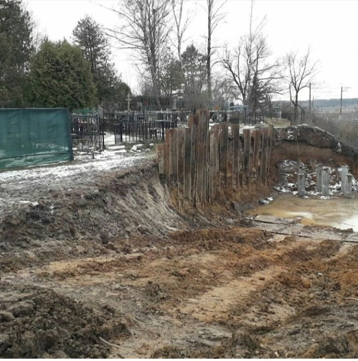 Оказалось дорога пойдет над сельским кладбищем. Меньше метра отделяет ближайшую могильную ограду от восьмиметрового котлована.