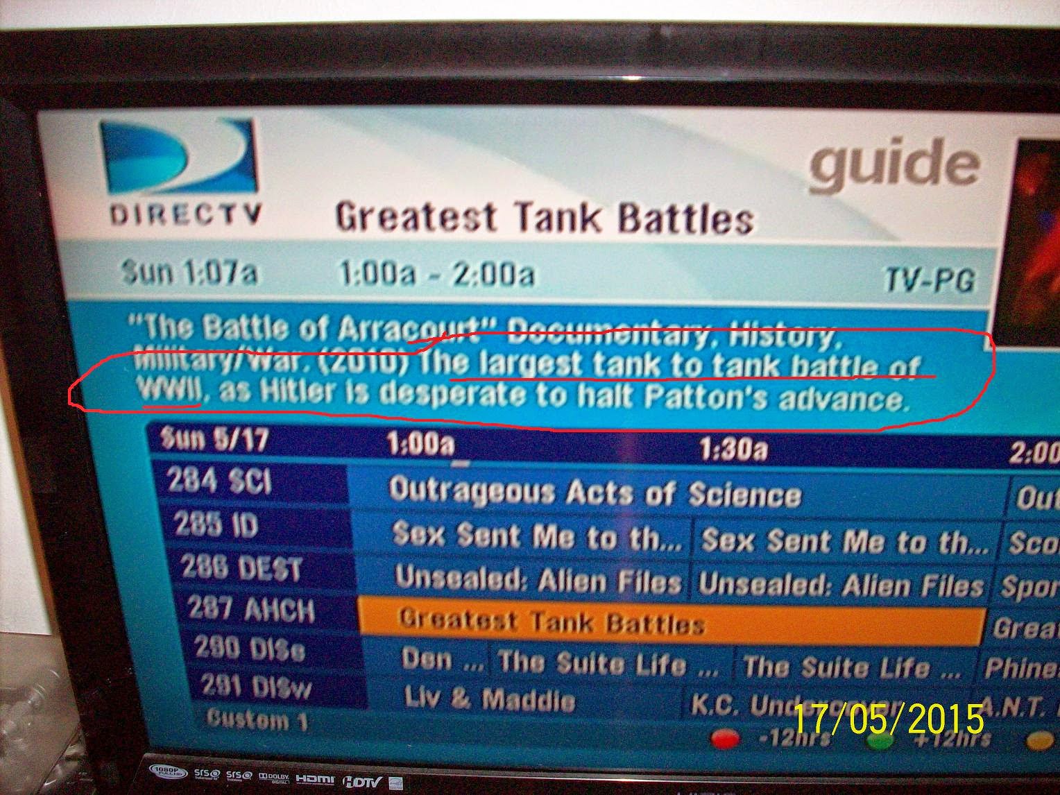 Ну а теперь собственно ко ВМВ, огромной лжи (на Западе и в позднем СССР) и о том, как реально применяются подобные уравнения. Перед вами фото экрана телевизора, на котором показана программа передач на Direct TV (спутник--очень поулярны в США), где на канале AHCH (American Heroes Channel--да, да--не меньше) в разделе Величайшие Танковые Сражения, т.н. Сражение под Арракуртом представлено как: