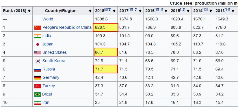 Господа расейские политологи и прочие американисты-аналитеги, зарубите себе на носу, а можете татуировку сделать: ни хрена вы Америки не знаете и знать не можете. Реальный размер экономики США не 23 триллиона зелёных бумажек, а в реальности в районе 10-12 триллионов. Экономика Китая уже раза в три больше экономики США, в то время как экономика России равна, а скорее всего уже и больше экономики Германии. Объяснять Михееву и иже с ним что такое предикторы--это всё равно что объяснять ребёнку какие технологические и логистические цепочки вовлечены в, скажем, создание и производство АПЛ пр. 885 Ясень, или МС-21 с ПД-14. Это практически невозможно, потому что это вообще за пределами понимания господ отучившихся на "филосовских факультетах". Приведу один пример, причём наглядный. Производство стали в млн тонн: