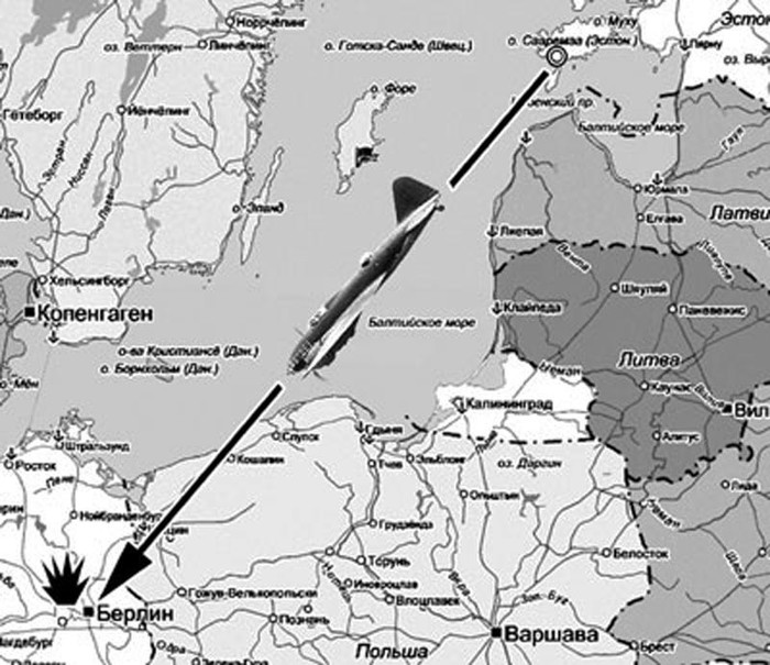 Нас собрали в штабе. К большой классной доске флаг-штурман прикалывает карту. Жирная черная линия тянется через материк, море, снова материк и упирается концом в Берлин. От Берлина черная линия уходит в море, делает несколько изгибов и возвращается к исходному пункту. Все стало ясно – полёт намечен на Берлин.