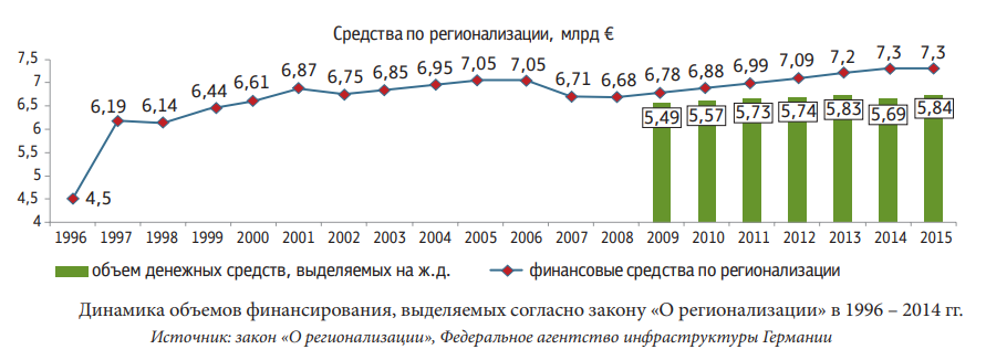 Средства по регионализации выделяются субъектам из федерального бюджета и могут быть направлены властями федеральных земель на организацию городских и пригородных перевозок всеми видами транспорта. Доля средств, выделяемых на железнодорожный транспорт, в период с 2009 по 2015 гг. составляла около 80% от общего объема средств по регионализации, что в абсолютном выражении соответствовало в среднем €5,7 млрд.
