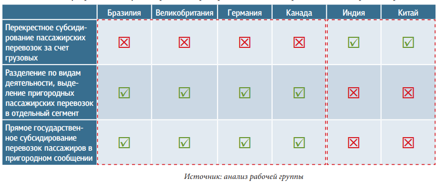 Таким образом, из рассмотренных железнодорожных систем государственное субсидирование перевозок пассажиров в пригородном сообщении не осуществляется только в Индии и Китае. В этих странах пригородные пассажирские перевозки объединены вместе с другими видами деятельности в рамках единой железнодорожной компании, и осуществляется перекрестное субсидирование пассажирских перевозок за счет грузовых. Во всех государствах, где пригородные железнодорожные пассажирские перевозки организационно обособлены и отсутствует перекрестное субсидирование, обязательно осуществляется государственная поддержка данного вида деятельности.