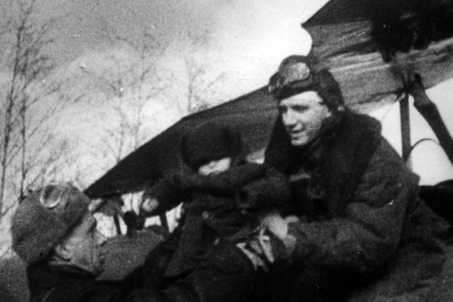 На кадрах кинохроники, снятых фронтовым оператором Марией Суховой, запечатлён лётчик гвардии лейтенант Мамкин А. П., усаживающий эвакуируемых детей в самолет Р-5. Апрель 1944 г.