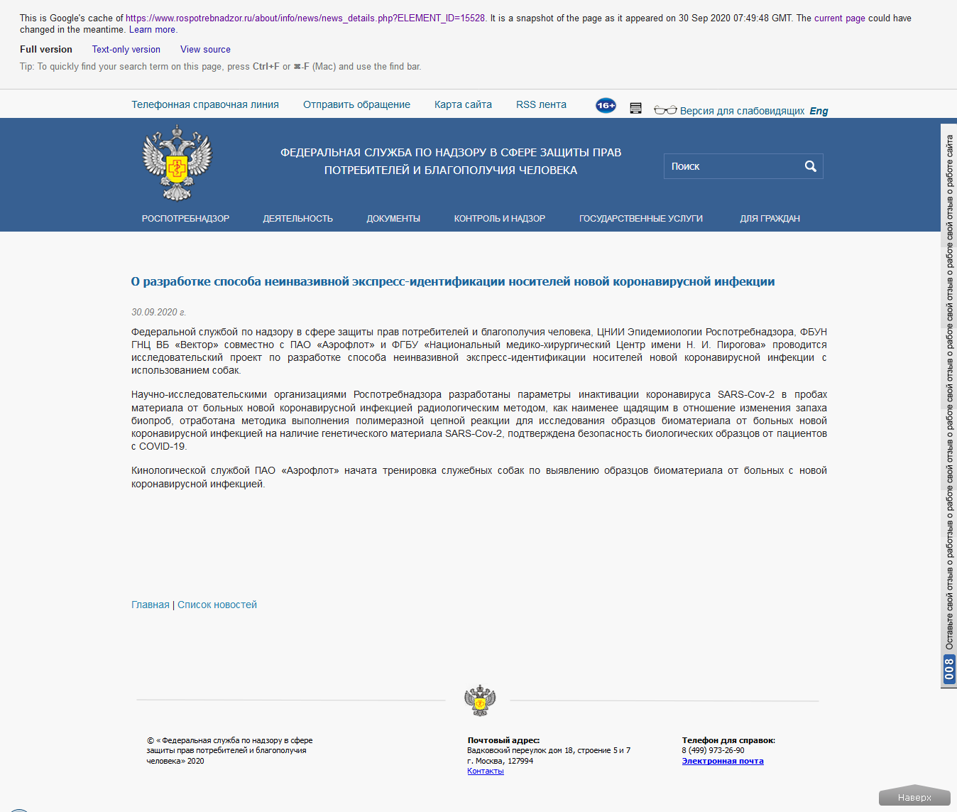 С сайта федерального Роспотребнадзора пропало сообщение о том, что ведомство совместно с несколькими другими организациями разрабатывает способ идентификации больных коронавирусом с помощью собак.