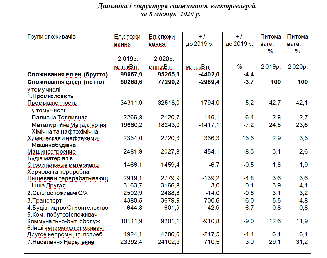 В таблице видна сильная разница между потреблением-брутто и потреблением-нетто как в прошлом, так и в этом году. На 5,2% просела промышленность, особенно металлургия в абсолютных цифрах (-1417,1 млн. кВтч), и машиностроение в относительных(-18,3%), но выросло потребление в химии и нефтехимии, а также потребление населением.