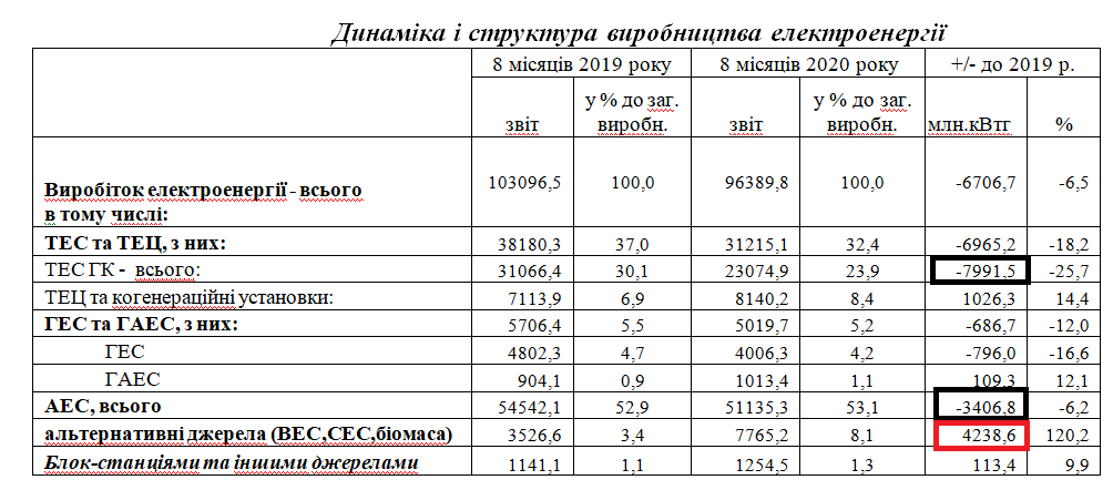 За 8 месяцев выработка электроэнергии сократилась на 6,5%. Сильнейший провал виден в производстве электроэнергии ТЭС и АЭС. При этом наблюдается сильнейший рост зеленки. При чуть меньшей мощности по сравнению с ГЭС-ГАЭС зеленкой выработано существенно больше электроэнергии.