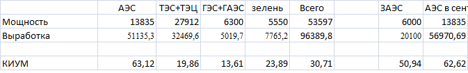 Но вернемся к Украине. Зная мощности электростанций и число дней до 1 сентября (366- 122=244) можно получить КИУМ разных типов электростанций. Так как доля зеленки росла в течение года, то средняя мощность для СЭС была принята 4250 МВт, ВЭС – 1050 МВт и на биотопливе 150 МВт.