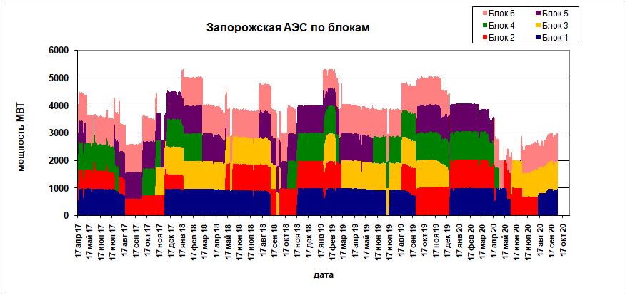 Как ни странно КИУМ зелени на втором месте после АЭС (если брать номинальную мощность зеленки 6153 МВт на конец августа, то КИУМ будет равен 21,54). Очевидно, что на текущий момент мощности ТЭС избыточны. С учетом продолжавшихся балансовых ограничений для АЭС Украины в сентябре выработка электроэнергии была ниже прошлого года и, по моим подсчетам, составила 5835,394 млн. кВтч, что еще снижает КИУМ АЭС до 62,62%. Самой «пострадавшей» от балансовых ограничений является ЗАЭС. Неудивительно, ведь были дни, когда из ее шести блоков три-четыре были отключены из-за ремонта и балансовых ограничений.