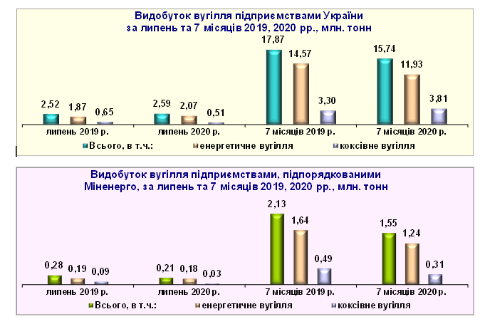 Добыча угля всеми предприятиями и отдельно шахтами Минэнерго Украины за 7 месяцев приведены ниже.