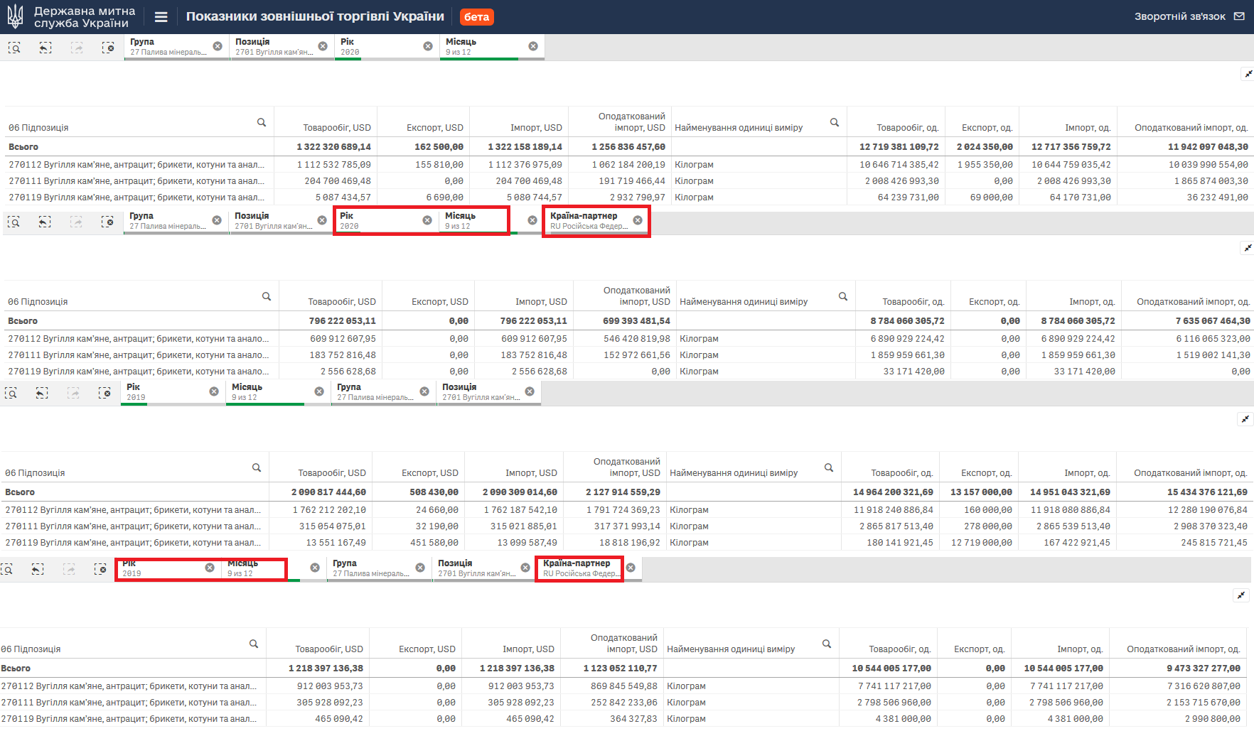 На рисунке видно, что запасы угля выросли более чем вдвое, по сравнению с концом сентября прошлого года и составляют 2,9 млн. т. За счет чего выросли остатки угля? Может вырос его импорт. Ниже таблицы общего импорта угля на Украину и в том числе из РФ за 9 месяцев 2020 года по данным украинской таможни.
