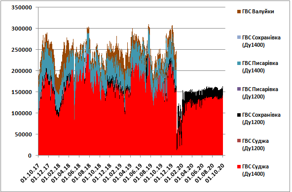 Добыча газа на Украине за 9 месяцев этого года составила, по моим оценкам, 15,235 млрд. куб. м, что немного ниже 2019 года (15,521 млрд. куб. м). Транзит за 9 месяцев сократился существенно с 65,4 до 39,5 млрд. куб. м. Транзит идет через две точки входа - Писаревку и Сохрановку. Ниже суточные объемы прокачки газа.