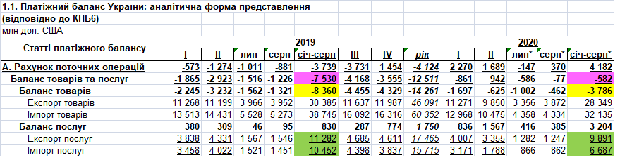 то за счет более лучшего баланса услуг ($3,204 млрд. сейчас против $830 млн. в прошлом году) общий баланс товаров и услуг выглядит (фиолетовый) хорошо -$582 млн. против -$7,530 млрд. Экспорт услуг уменьшился в том числе за счет трубопроводного транспорта (на $500 млн.), а импорт услуг, в основном, за счет сокращения выездного туризма (подорожі с $4,672 до $2,552 млрд.)