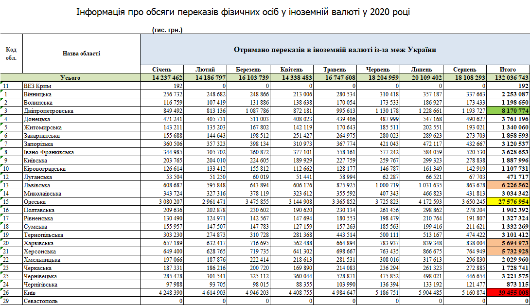 Также сообщается, что в период с января по август (включительно) 2020 года объем денежных переводов трудовых мигрантов в Украину составил 5,93 млрд долл., что всего на 40 тыс. долл. меньше, чем за этот же период 2019 года (5,97 млрд долл.).