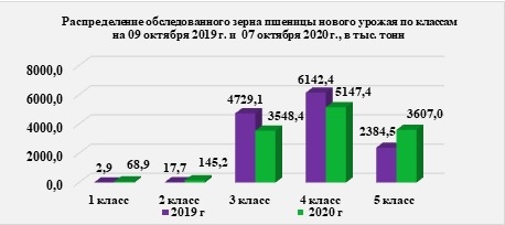 пшеницы 5 класса – 3 607,0 тыс. тонн или 28,8 % от обследованного зерна, в том числе: