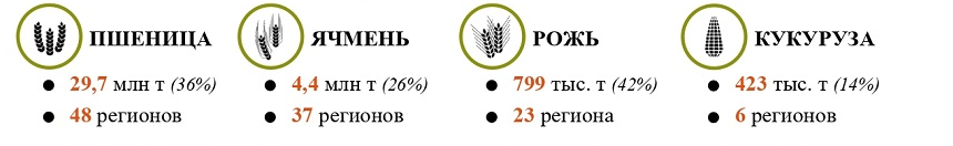 Из них пшеница обмолочена с площади 28,6 млн га или 97,3% к посевной площади, намолочено 86,7 млн тонн зерна при урожайности 30,3 ц/га. Ячмень обмолочен с площади 8,1 млн га или 95,3% к посевной площади, намолочено 21,9 млн тонн при урожайности 26,9 ц/га. Кукуруза на зерно обмолочена с площади 1,2 млн га или 40,9% к посевной площади, намолочено 5,7 млн тонн при урожайности 48,6 ц/га. Рис обмолочен с площади 119,6 тыс. га или 60,9% к посевной площади, намолочено 763 тыс. тонн при урожайности 63,8 ц/га.
