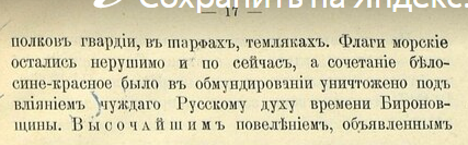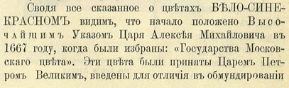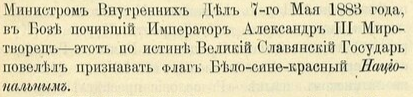 "Высочайшим повелением, объявленным министром внутренних дел 7 мая 1883 года, в Бозе почивший император Александр III Миротворец – этот поистине великий славянский государь повелел признавать флаг бело-сине-красный Национальным" - стр. 17